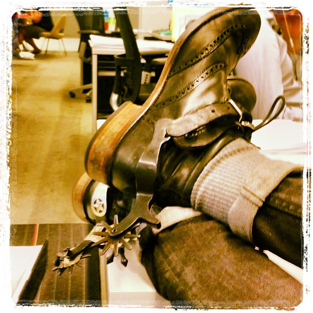 Today I wore my spurs into work – a purchase inspired by Tanya Johnson and endorsed by Peter Kovacs. I was not able to find a place in manhattan to purchase them so Amazone.com is your best bet. Some notes :: Hard to walk down stares, they do make that cowboy “clink” sound (so satisfying) and they are definitely something novel to see at any job involving suites!