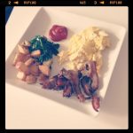 Bfast for my bf – scrambled eggs, fried potatoes, lamb bacon, spinach.