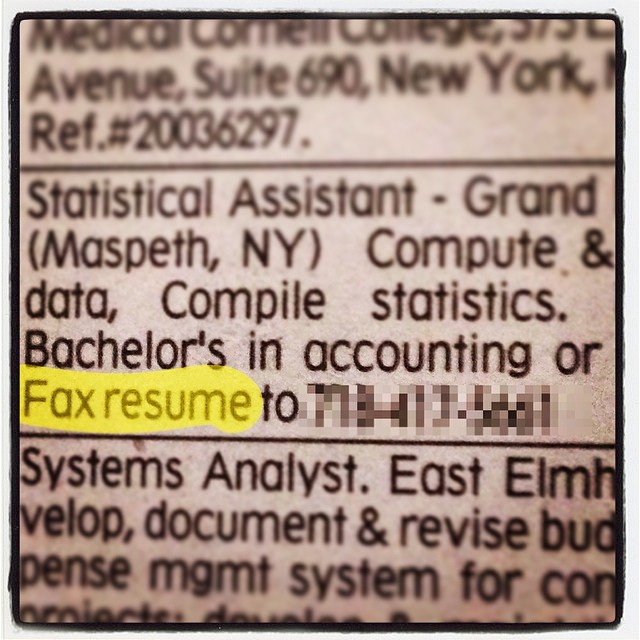 | I just think it is hillarious that the NY Times has jobs from Monster.com in print and then has listings for FAX resume submissions!