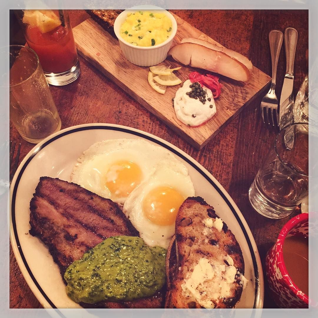 I had a delicious meal with Angel here at Cherry Point. It was a recommendation from my good friend Devon, who had yet to lead me astray. The menu was pretty rustic but a good assortment for breakfast / brunch. There were several cured fish dishes as well as a nice selection of cocktails. We started with a Sticky Toffee Bun and homemade clotted cream, followed by an orange juice and good coffee, finished with the Brisket and Eggs made to perfection.