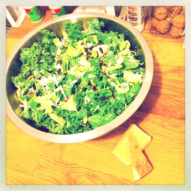 kale, Brussels sprouts, roasted pine nuts, pecorino tuada cheese