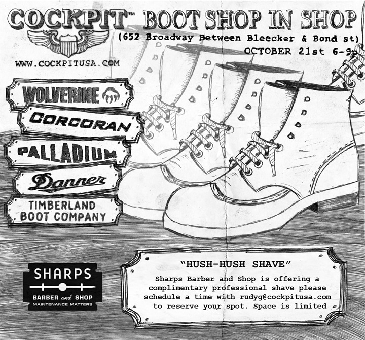 BOOT SHOP-IN-SHOP by Cockpit USA This events creative material was designed by me Zachary A. Martz The Cockpit USA general store launches its 3rd shop in shop with boots by Wolverine, Palladium, Timberland Boot Co. , Corcoran, and Danner. For 30 days Cockpit turns...