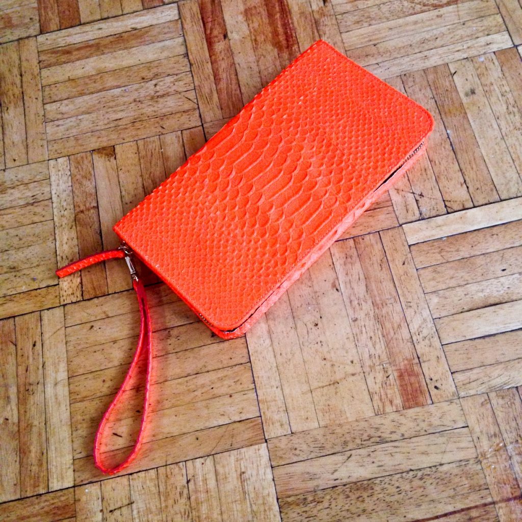 NEON ORANGE, LEATHER, PYTHON, ZIP, CLUTCH WITH MOBILE PHONE POCKET.
